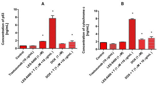 The concentration of p53 (A) and cytochrome C (B) in AGS gastric cancer cells after 24 h incubation with trastuzumab (10 μg/mL), LES-6400 (1 μM), LES-6400 + T (1 μM + 10 μg/mL), DOX (1 μM), DOX + T (1 μM + 10 μg/mL). The ANOVA and Tukey tests were used to demonstrate differences between the control cells and the cells exposed to varying concentrations of the tested compounds. Data presented in ng/mL. * p < 0.05 versus control group.