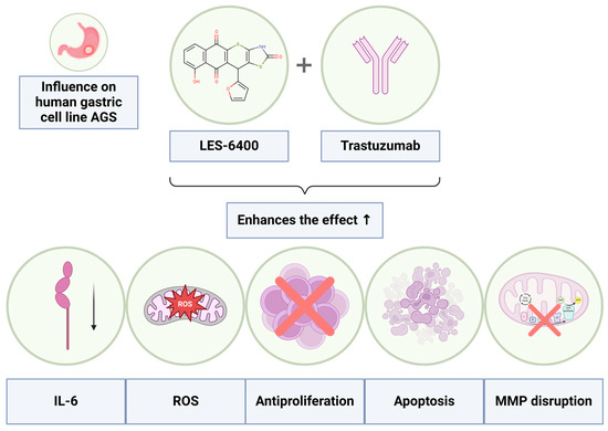 The conducted studies demonstrated a significant advantage of the combined therapy using the juglone-based Thiopyrano[2,3-d]Thiazole derivative LES-6400 and the anti-HER2 antibody (trastuzumab) over monotherapies with these agents in the treatment of AGS gastric cancer. These results indicate a synergistic effect of both substances (Figure 12), leading to increased induction of apoptosis through disruption of mitochondrial membrane potential and potential induction of oxidative stress within cancer cells. Additionally, the combined therapy resulted in elevated levels of p53 protein and cytochrome C, which may suggest the activation of the intrinsic apoptotic pathway. Decreased IL-6 concentrations were also observed, indicating a modulation of the inflammatory response by the combined therapy.