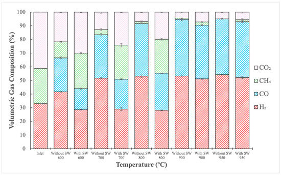 While the H2/CO ratio is essential in determining whether syngas is suitable for a given application, it cannot be the sole deciding parameter. The concentration of other hydrocarbons in the gas must also be considered. Table 1 shows that a higher H2/CO ratio was obtained at 600 °C when using SW. However, Figure 1 shows that, under these conditions, the reformed syngas contained higher amounts of unconverted CH4 and CO2 than in all other experiments. Thus, the best outcome was achieved at 950 °C without SW, which resulted in less unreacted CH4 and CO2 with a H2/CO ratio of 1.33. Generally, Fischer–Tropsch synthesis requires a H2/CO ratio of about 2. However, when using iron-based catalysts, ratios as low as 0.5 are feasible [13,14,15]. Thus, the H2/CO ratio achieved during these experiments could fit in the acceptable range for Fischer–Tropsch synthesis.