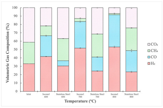 To evaluate the influence of the reactor material on the process, experiments were conducted in a stainless steel (SS) reactor, without steel wool, under the same conditions as the reactions using the Inconel reactor. The results of this investigation are shown in Figure 3, which compares gas compositions after reforming, both in the Inconel and SS reactors, at temperatures ranging from 600 to 800 °C.