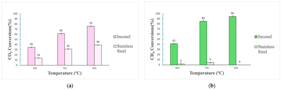 Comparison of CO2 (a) and CH4 (b) conversions after reforming in Inconel and stainless-steel reactors (600–800 °C, without steel wool).