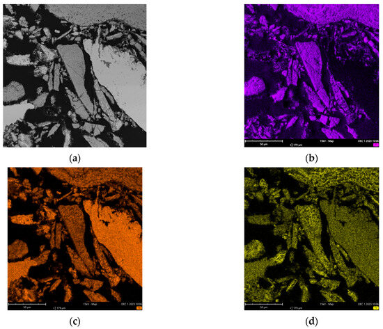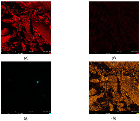 Energy-dispersive X-ray spectroscopy (EDS) was employed to ascertain the elemental composition of certain metals. Analyses were conducted utilizing an Electron Microscope (Desktop scanning electron microscope (SEM) equipped with EDS) from ThermoFisher Scientific Phenom XL G1 (Waltham, MA, USA). SEM was used for high-resolution imaging and detailed morphological insights. This allowed precise identification of surface features, guaranteeing that the analyzed zones would be representative of the sample. Combined with EDS, this can enable an in-depth study of the elemental distribution across the sample’s surface. Before analysis, the samples were prepared by embedding them in epoxy resin, followed by cutting and polishing until a very-low-roughness section was obtained. This step was essential for accurate mapping and quantitative analysis, as samples must be flat and smooth to minimize measurement errors. Quantitative analysis on a tilted or rough surface can lead to significant errors, potentially up to 100% for certain elements. Finally, a conductive metal coating (gold) was applied via sputter coating to prevent charging effects during analysis.