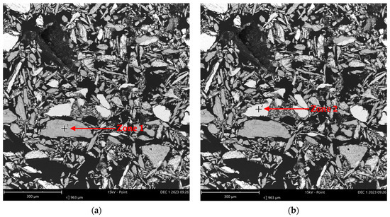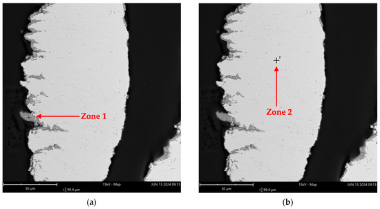 EDS analysis imaging in two zones from sample A (from Inconel reactor used in reactions) (FOV: 963 µm; mode: 15 kV-Point; detector: BSD Full): (a) Zone 1 and (b) Zone 2 indicate the specific regions chosen for the elemental composition analysis.