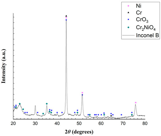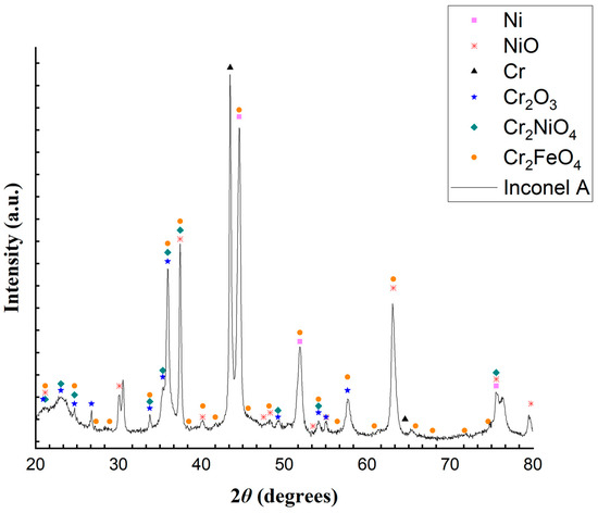 An important observation regarding the results presented from the analyses of samples A and B from the Inconel reactor is that, even if the elementary analyses were carried out at specific points in the sample, which may or may not be representative of the reactor, these analyses serve as a way of understanding the possible oxides present in the reactor. In addition, both samples A and B were analyzed by XRD, and the results are shown in Figure 9 and Figure 10.
