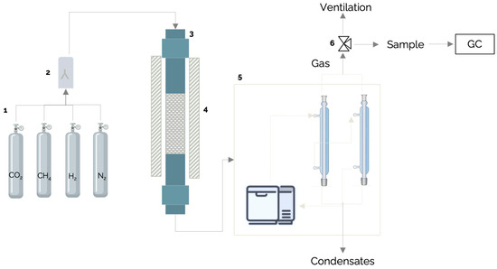 Simplified flow diagram of the reforming setup used in this work (1: individual gas cylinders for CO2, CH4, H2, and N2; 2: static mixer; 3: fixed-bed reactor; 4: oven; 5: cold trap system, including a chiller and condensers; 6: 3-way valve).