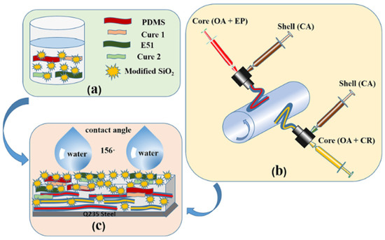 - Ji, X.H.; Ji, W.H.; Pourhashem, S.; Duan, J.Z.; Wang, W.; Hou, B.R. Novel superhydrophobic core-shell fibers/epoxy coatings with self-healing anti-corrosion properties in both acidic and alkaline environments. React. Funct. Polym. 2023, 187, 105574. [Google Scholar] [CrossRef]