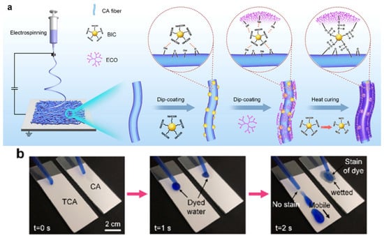- Zhao, J.; Zhu, W.X.; Wang, X.F.; Liu, L.F.; Yu, J.Y.; Ding, B. Fluorine-free waterborne coating for environmentally friendly, robustly water-resistant, and highly breathable fibrous textiles. ACS Nano 2020, 14, 1045–1054. [Google Scholar] [CrossRef]