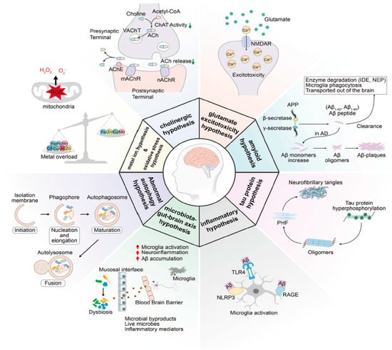 The metal ion hypothesis examines the dysregulation of metal ions, particularly copper, zinc, and iron, which plays a significant role in the pathogenesis of AD. This hypothesis suggests that metal dyshomeostasis can lead to oxidative stress, which is linked to various pathological events in AD, such as amyloidosis and tauopathy. For instance, iron-induced oxidative stress can result in the release of iron from iron-containing proteins, leading to neuronal death through mechanisms like ferroptosis and lipid peroxidation. Similarly, copper can induce toxicity by binding to specific proteins, resulting in cellular damage. Zinc deficiency is also highlighted as a factor that may contribute to glutamate excitotoxicity and synaptic dysfunction in AD. Overall, the accumulation and mismanagement of metal ions are closely associated with the neurodegenerative processes observed in AD [].