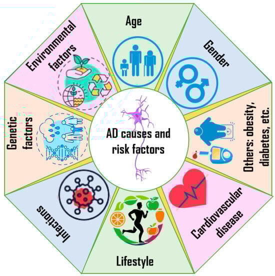 Furthermore, sedentary lifestyles and bad dietary habits, such as consuming large amounts of carbs and saturated fats, have been connected to an increased risk [,,,]. Conversely, maintaining cardiovascular health, eating a balanced diet rich in antioxidants, and exercising frequently can all lower the incidence of AD [,]. Figure 2 summarizes the causes and factors of AD.