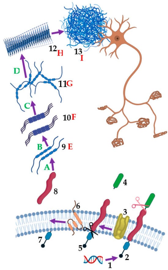 An example of how the major Aβ-targeted treatments work, based on the amyloid cascade theory. (1) RNA based therapies, (2) Amyloid precursor protein (APP), (3) β-Site amyloid precursor protein cleaving enzyme (BACE), (4) Soluble amyloid precursor protein-β (sAPPβ), (5) 99-Residue C-terminal fragment (C99), (6) γ-Secretase inhibitors/modulators, (7) Amyloid precursor protein intracellular domain (AICD), (8) Amyloid-β (Aβ), (9) Monomers, (10) Oligomers, (11) Protofibrils, (12) Fibrils, (13) Amyloid plaques. A to D (green) indicate the targets of Aβ aggregation inhibitors, E to I (red) indicate the targets of active and passive immunotherapies.