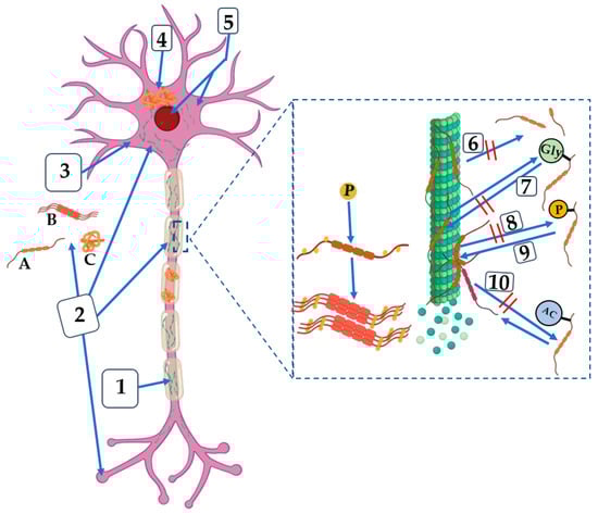 An example of the primary therapeutic targets connected to tau and their mode of action. (1) Microtubule stabilizing agent; (2) Active or passive immunization; (3) Modulation of autophagy or proteasomal digestion; (4) Aggregation inhibitor; (5) Tau expression inhibitor; (6) Caspase inhibitors; (7) O-GlcNAcase inhibitors (OGA); (8) Kinase inhibitors; (9) Phosphate activators; (10) Acetylation inhibitors. A, monomers; B, oligomers; C, aggregate; P, phosphate; AC, acetyl group; Gly, glycosyl group.