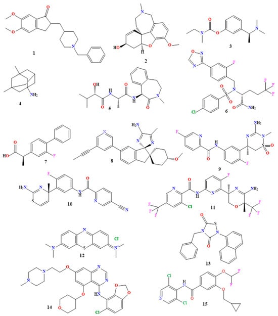 Chemical structures of (1) donepezil, (2) galantamine, (3) rivastigmine, (4) memantine, (5) semagacestat, (6) avagacestat, (7) tarenflurbil, (8) lanabecestat, (9) verubecestat, (10) atabecestat, (11) umibecestat, (12) methylene blue, (13) tideglusib, (14) saracatinib, and (15) roflumilast.
