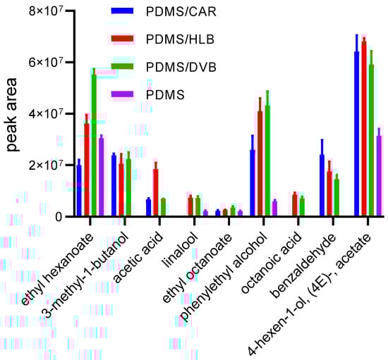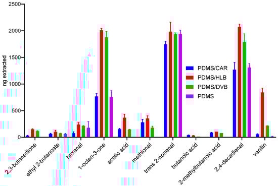 In the second part of this study, we compared all types of TF-SPME devices available commercially, i.e., pure PDMS, HLB/PDMS, CAR/PDMS, and DVB/PDMS.
