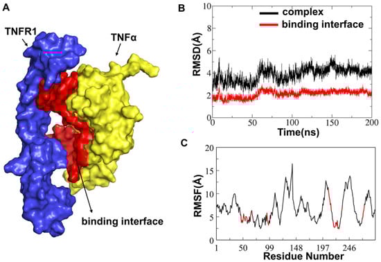 (A) Initial model of TNFα-TNFR1 complex (PDB ID: 7KPB). The interaction interface is shown in red. (B,C) RMSD and RMSF of the TNFα-TNFR1 complex (black) and the binding interface (red).
