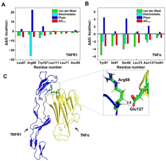 Per-residue free energy decomposition diagrams for TNFR1 (A) and TNFα (B). The residues with energy less than −1 kcal·mol−1 were plotted, and different energy terms are shown with different colors. (C) Hydrogen bond formed between Arg68 and Glu127.