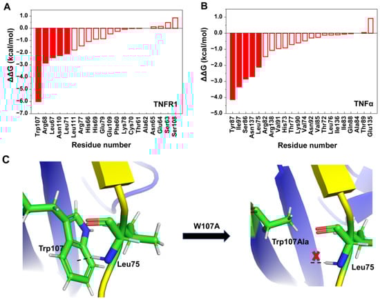 Binding free energy changes after mutations (within 5 Å of binding interface). (A) TNFR1; (B) TNFα. Hot-spot residues contributing −2 kcal·mol−1 are filled in red. (C) Interaction with Leu75 before and after Trp107 mutation. The blue and yellow ribbons represent TNFR1 and TNFα, respectively. X represents the interaction disappeared after mutation.