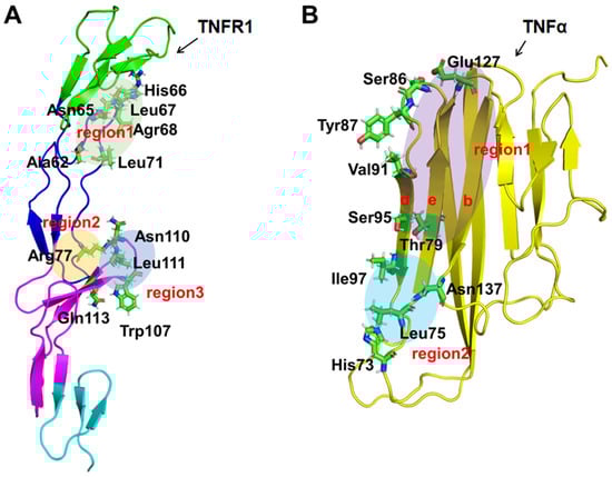 Binding sites schematic diagram of TNFR1 (A) and TNFα (B). The CRD1–4 regions of TNFR1 were represented from top to bottom.