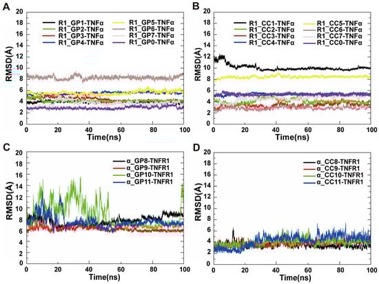In order to identify peptides with high affinity and stability subsequently, the corresponding cyclic peptide-protein complex initial models were constructed using HADDOCK (v2.4) software, and then the classical MD simulations and the MM-PBSA binding free energy calculations were performed. The RMSD curves of different CPs-TNFα (Figure 7A,B) and CPs-TNFR1 (Figure 7C,D) complexes were calculated based on the equilibrated 100 ns trajectory in each complex system. As shown in Figure 7A, for R1_GPX-TNFα complexes, the averaged RMSD values were in the range of 3–8 Å, and the overall fluctuations of the complexes were quite small, indicating that their binding was stable. For R1_CCX-TNFα complexes (Figure 7B), the averaged RMSD values were in the range of 3–10 Å, which was slightly higher than that of R1_GPX-TNFα complexes as a whole. Distinguishingly, for α_GPX-TNFR1 complexes (Figure 7C), RMSD values were around 8 Å, and the overall fluctuations were quite small except for α_GP10-TNFR1 complexes, which were excluded directly in the screening. However, this phenomenon did not appear in α_CCX-TNFR1 complexes. For α_CCX-TNFR1 complexes (Figure 7D), the RMSD fluctuations became smaller with the values of around 3 Å only.