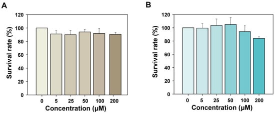 Cell toxicity of the different concentrations of cyclic peptides (A) cyclic peptide R1_CC4. (B) cyclic peptide α_CC8. Data represented as mean ± SEM (n = 3).
