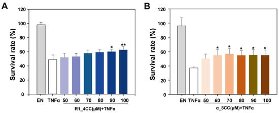 Survival rate of L929 cells in presence of 1 μg/mL Etanercept (EN positive control) and different concentrations of cyclic peptides. (A) cyclic peptide R1_CC4. (B) cyclic peptide α_CC8. Data are representative of three replicates. Data represented as mean ± SEM (n = 3). (* p < 0.05 and ** p < 0.01).