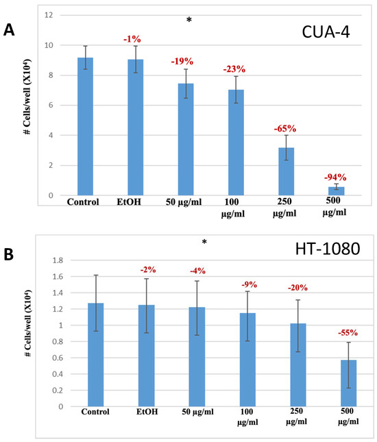 Manuka treatment decreased proliferation. The indicated cells were plated into 24-well plates and treated for 24 h with the indicated concentrations of manuka essential oil. Controls were left untreated (“control”) or were treated with ethanol (vehicle for oil dilution) (“EtOH”). (A) CUA-4 cells. * results were the average of 20 independent experiments and were found to be significant using ANOVA (α = 0.005). (B) HT-1080 cells. * results were the average of 10 independent experiments and were found to be significant using ANOVA (α = 0.05).