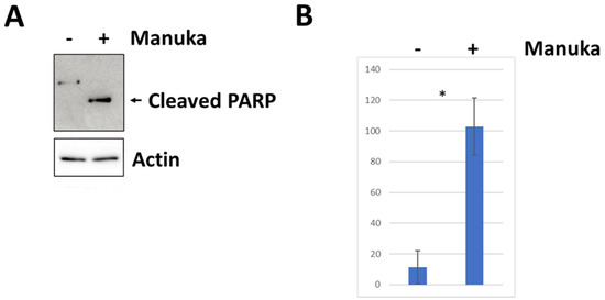 Manuka treatment causes the apoptosis of normal fibroblast cells. (A) CUA-4 normal fibroblast cells were plated into 100 mm plates, serum-starved overnight, and treated for 4 h with 1000 µg/mL of manuka essential oil. Controls were left untreated. Western blot analysis was performed using anti-PARP antibodies (Cell Signaling). Actin detection confirms equivalent loading. (B) The densitometry of the cleaved PARP bands. * results are the average of 11 independent experiments and were found to be significant using a t test (p < 0.10).