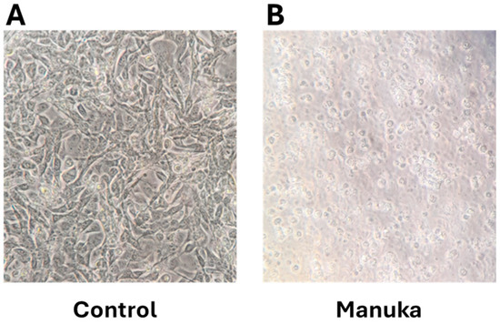 Manuka treatment causes morphology changes associated with late apoptosis in fibrosarcoma cells. HT-1080 fibrosarcoma cells were plated into 100 mm plates, serum-starved overnight, and treated for 24 h with 1000 µg/mL of manuka essential oil (B) or left untreated (control) (A). Manuka-treated cultures demonstrate smaller, rounded cells that demonstrate membrane blebbing.
