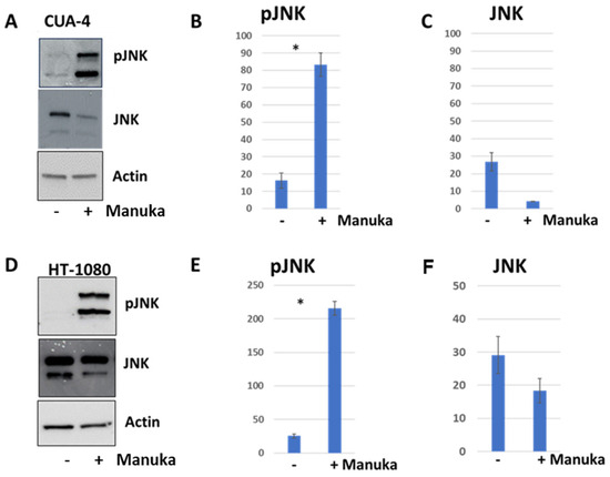The mitogen-activated protein kinase c-Jun N-terminal kinase (JNK) can be activated by cellular stress. Therefore, the levels of active JNK were measured in both CUA-4 fibroblast cells and HT-1080 fibrosarcoma cells following a 4 h treatment with 1000 µg/mL manuka essential oil, while control cultures were left untreated. Western blot analysis was performed to detect phosphorylated JNK (pJNK) and total JNK. For both CUA-4 fibroblast cells and HT-1080 fibrosarcoma cells, the levels of pJNK were significantly increased in the cultures treated with manuka essential oil (Figure 8). There was no significant difference in the levels of total JNK present in both the treated and untreated cells. The blots were also re-probed with actin to demonstrate equivalent loading.