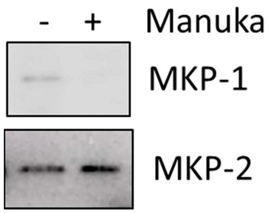 Dual-specificity mitogen-activated protein kinase phosphatases are a family of proteins which can negatively regulate the MAPK family through dephosphorylation. Since the level of activated JNK was altered by manuka essential oil, the expression of phosphatases that could regulate JNK was measured. HT-1080 fibrosarcoma cells were treated with manuka, and then Western blotting was used to detect both MKP-1 and MKP-2. MKP-1 expression was low in untreated cultures, but further decreased upon treatment with manuka essential oil. Conversely, MKP-2 expression increased in fibrosarcoma cells treated with manuka essential oil (Figure 9).