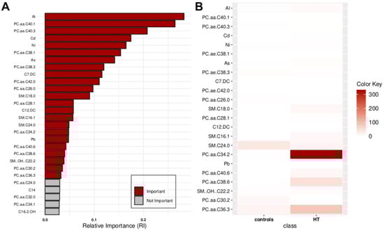 Key features identified at the top of the MCFS-ID prioritization analysis of all participants across controls vs. HT patients. (A) The Relative Importance (RI) of ranked features, with red color indicating significant features and gray denoting those below the cutoff (see Section 4). (B) The mean values of the significant features in each decision class correspond to the analyzed grouping variable.