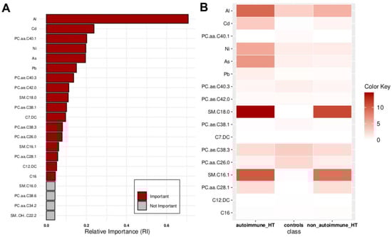 Key features identified at the top of the MCFS-ID ranking analysis of the HT patients across autoimmune HT and non-autoimmune HT. (A) The Relative Importance (RI) of ranked features, with red indicating significant features and gray denoting those below the cut-off point (refer to Section 4). (B) The average values of significant features across each decision class correspond to the analyzed grouping variable.