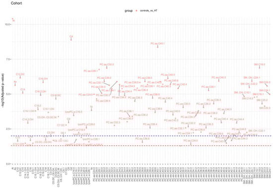 The Manhattan plot illustrates the −log10 adjusted p-values from the Mann–Whitney–Wilcoxon test to compare the concentrations of analyzed chemical compounds between the patient groups studied. The dashed red and blue lines delineate the thresholds for adjusted p-values at 0.05 and 0.01, respectively. Additionally, only those points representing statistically significant comparisons have been annotated with labels on the plot.