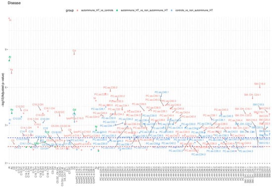 Our study confirms that hypothyroidism is associated with important changes in the plasma lipid profile of patients beyond those already reported by other researchers regarding TSH [26], LDL-cholesterol, and TG levels [27]. Studies suggest that overt HT is a secondary cause of hyperlipidemia [28], so further insights into the human lipidome in HT patients are necessary. The use of lipidomics, and thus insights into the world of molecules such as acylcarnitines, glycerophospholipids, and sphingomyelins (overlooked in routine testing) in patients with pharmacologically balanced thyroid hormone levels, may not only help in drug selection, but may also predict some health complications. This includes also patients with Hashimoto’s thyroiditis, in which thyroid autoimmune processes affect lipid metabolism by altering thyroid hormone levels [29].