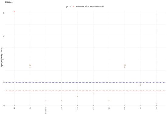 The results of this statistical analysis are detailed in Figure 4, Figure 5 and Figure 6, which illustrate significant differences in the concentrations of chemical compounds and trace elements between participant groups, grouped by demographic, clinical, and biochemical variables. Figure 4 compares control subjects and HT patients, highlighting the differences in the biochemical profile between analyzed subgroups. Figure 5 displays these comparisons, providing insight into how compound concentrations differ by disease classification. Figure 6 focuses on HT patients only, comparing the concentrations of trace elements between autoimmune HT and non-autoimmune HT patients. These figures present a clear view of significant statistical findings, showing how the concentration of chemical compounds analyzed varies across different clinical categories. The results presented in Figure 4, Figure 5 and Figure 6 are also summarized in Table 4, Table 5 and Table 6, which highlight the most significantly altered lipids and toxic elements that differentiate between controls, autoimmune HT, and non-autoimmune HT.