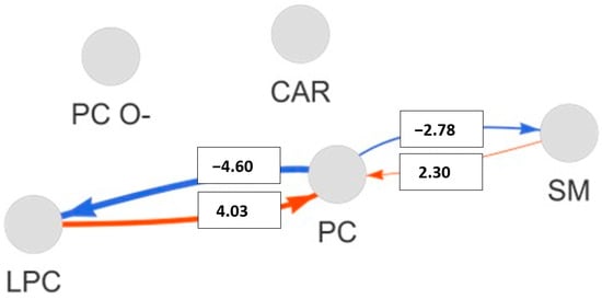 Pathway activity network of lipid classes comparing controls and HT. The figure depicts a pathway activity network connecting lipid classes, with nodes representing phosphatidylcholine (PC), acylcarnitines (CAR), lysophosphatidylcholine (LPC), and sphingomyelins (SM). Pathways between these lipid classes are illustrated by lines, with color-coding: red for pathways with positive activity values and blue for negative ones. The thickness and color intensity of the lines represent the frequency and strength of each pathway’s activity, which is quantified by a pathway activity score.