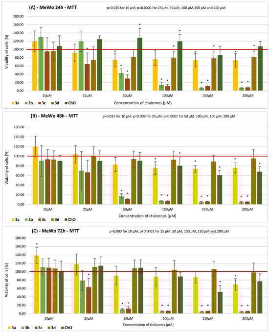 The results of the MTT assay on the viability of MeWo cells incubated with bis-chalcones 3a–3d and ChO for (A) 24 h, (B) 48 h, and (C) 72 h. Descriptive data are presented as the mean ± SD. The results of the ANOVA analysis are described in figures (A–C). Statistically significant differences versus the control cells are marked with an asterisk (* p ≤ 0.0001). The horizontal bold line represents the viability of the control (0.2% DMSO-treated) cell.