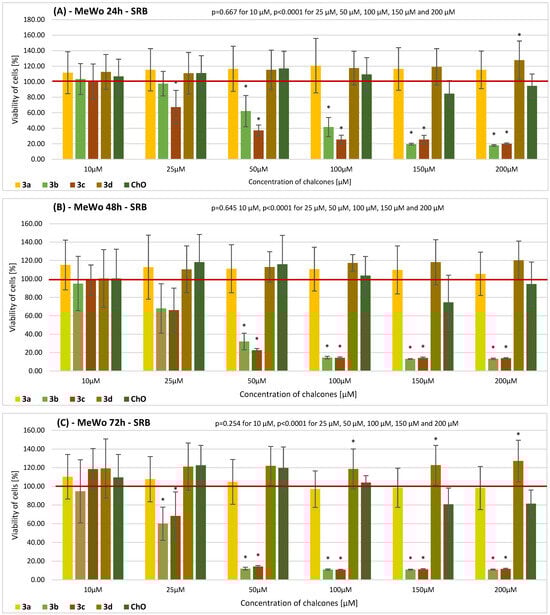 The results of the SRB assay on the viability of MeWo cells incubated with chalcones 3a–3d and ChO for (A) 24 h, (B) 48 h, and (C) 72 h. Descriptive data are presented as the mean ± SD. The results of the ANOVA analysis are described in figures (A–C). Statistically significant differences versus the control cells are marked with an asterisk (* p ≤ 0.0001). The horizontal bold line represents the viability of the control (0.2% DMSO-treated) cells.