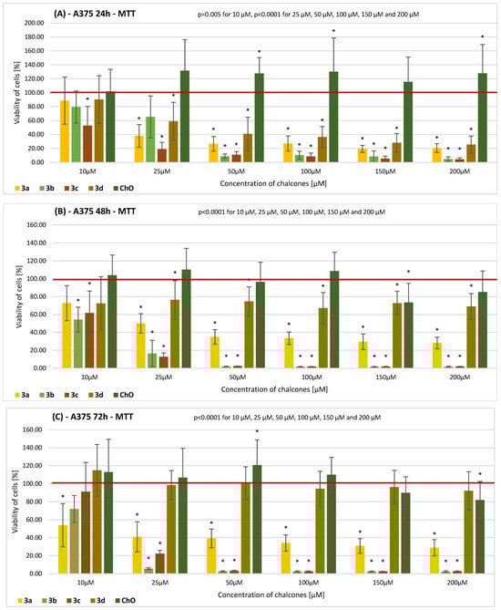 The results of the MTT assay on the viability of A375 cells incubated with chalcones 3a–3d and ChO for (A) 24 h, (B) 48 h, and (C) 72 h. Descriptive data are presented as the mean ± SD. The results of the ANOVA analysis are described in figures (A–C). Statistically significant differences versus the control cells are marked with an asterisk (* p ≤ 0.0001). The horizontal bold line represents the viability of the control (0.2% DMSO-treated) cells.