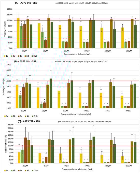 The results of the SRB assay on the viability of A375 cells incubated with chalcones 3a–3d and ChO for (A) 24 h, (B) 48 h, and (C) 72 h. Descriptive data are presented as the mean ± SD. The results of the ANOVA analysis are described in figures (A–C). Statistically significant differences versus the control cells are marked with an asterisk (* p ≤ 0.0001). The horizontal bold line represents the viability of the control (0.2% DMSO-treated) cells.