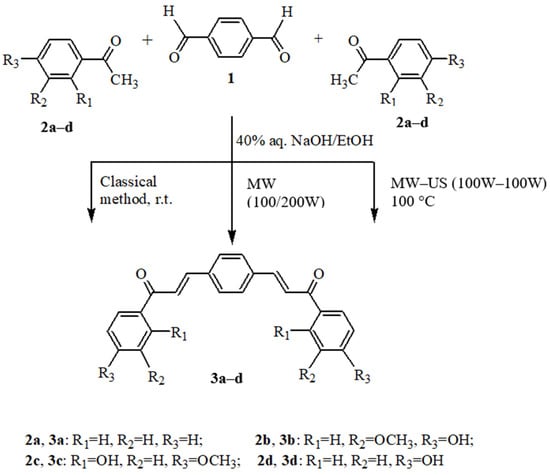 Synthesis of bis-chalcones 3a–3d under the classical method, alternative microwave, and microwave–ultrasound-assisted synthesis conditions.