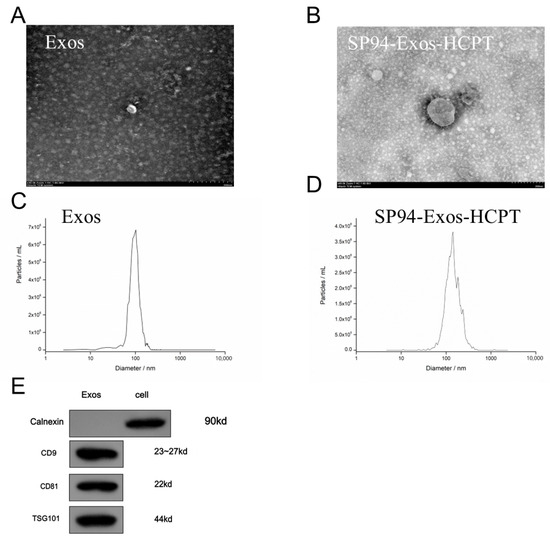 Characterization of exosomes. (A) TEM detection of the blank exosomes (Exos) morphology (Bar = 200 nm). (B) TEM image of drug-loaded exosomes (SP94-Exos−HCPT). (C) Size distributions of Exos. The mean particle size was 103 nm. (D) Size distributions of SP94-Exos-HCPT. The mean particle size was 133 nm. The data from C and D were based on the NTA measurements. (E) Exosomal biomarkers of Exos were detected by the Western blot analysis.