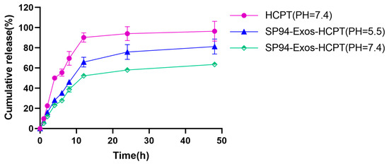 In vitro release profiles of HCPT and SP94-Exos−HCPT (error bars represent means ± standard deviation (SD) from three independent replicates).