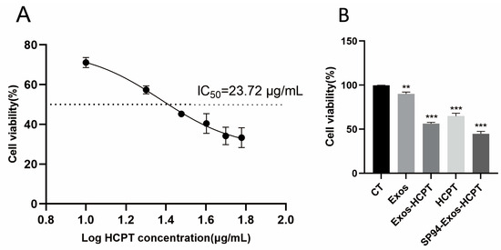 (A) The influence of HCPT on HepG2 cell vitality. (B) Effects of different drug groups on the proliferation of HepG2 cells in vitro (error bars represent means ± standard deviation (SD) from three independent replicates; ** p < 0.01, *** p < 0.001).