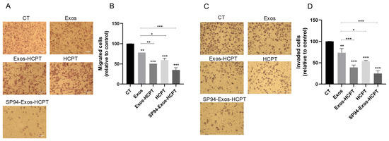 Cell migration and invasion were observed using a microscope, and the inhibition rate was calculated. (A) Representative diagram of cell migration. (B) The inhibition rate of cell migration. (C) Representative diagram of cell invasion. (D) The inhibition rate of cell invasion. (Drug group with 20 μg/mL Exos−HCPT, 20 μg/mL HCPT, and 20 μg/mL SP94-Exos−HCPT, Bar = 75 μm Error bars represent means ± standard deviation (SD) from three independent replicates. * p < 0.05, ** p < 0.01, *** p < 0.001).