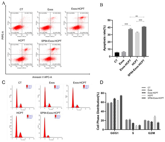 Flow Cytometry Analysis of the Cell Apoptosis and Cycle. (A) Apoptosis flow diagram of HepG2 cells treated with different preparations for 24 h. (B) The rate of cell apoptosis. (C) Flow diagram of cycle distribution of HepG2 cells after 24 h treatment with different preparations. (D) Cell cycle proportion in different groups. (drug group with 20 μg/mL Exos−HCPT, 20 μg/mL HCPT, and 20 μg/mL SP94-Exos−HCPT; error bars represent means ± standard deviation (SD) from three independent replicates. ** p < 0.01, *** p < 0.001).