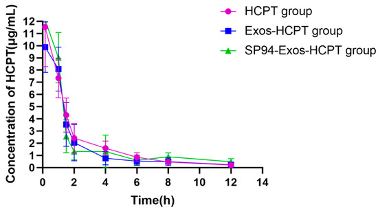 The concentration–time curves of HCPT in plasma of SD rats given HCPT Inject, Exos-HCPT, and SP94-Exos-HCPT after tail vein injection.