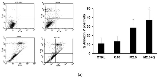 The representative histograms in Figure 3a indicate that treatment with quercetin alone caused an accumulation of cells in the S phase along with a slight increase in the G2/M phase. This suggests that quercetin may induce a block in the G2/M phase with cells gradually transitioning from S to G2/M. In contrast, treatment with MFA nearly completely arrested the cell population in the G2/M phase, a pattern also observed with the combined treatment. It is reasonable that MFA, as an alkylating agent, causes DNA damage, which triggers cell growth arrest in the G2/M phase through the ATM-p53 pathway [43].