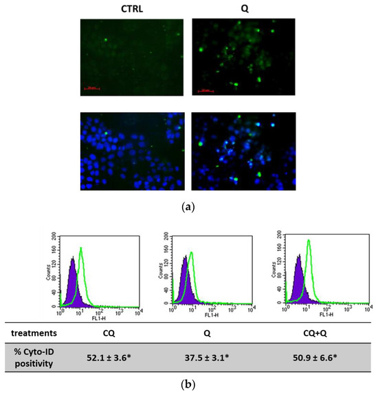 Microscopic observations indicated the presence of intracellular vacuoles in quercetin-treated RT112 cells (Supplementary Data Figure S2b), suggesting potential activation of an autophagic process. To investigate this hypothesis, several assays were performed to detect autophagy [45]. Following treatment with 10 μM quercetin for 24 h, RT112 cells were stained with Cyto-ID Green autophagy dye to visualize and quantify autophagosomes. As shown in Figure 6, this treatment resulted in a notable increase in fluorescent autophagic vacuoles, visible under fluorescence microscopy (Figure 6a) and quantified by flow cytometry, indicating a 37.5% increment compared to untreated cells (Figure 6b). Additionally, when the autophagic flux was inhibited using chloroquine (CQ), a pharmacological inhibitor, we observed an approximate increase of 50% in the presence of fluorescent vacuoles. Notably, the pre-treatment with CQ followed by quercetin did not cause a further increase in vacuole accumulation.