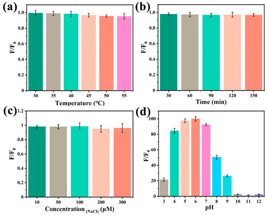 Effects of different conditions on R-GQDs fluorescence, (a) temperature; (b) anti-photobleaching time; (c) NaCl concentration; (d) pH. The values of F and F0 represent the measured fluorescence values of R-GQDs and the fluorescence values of R-GQDs measured under different conditions (ethanol: water, 30:70, v/v). Different F/F0 values have been marked with various colors in the figure.