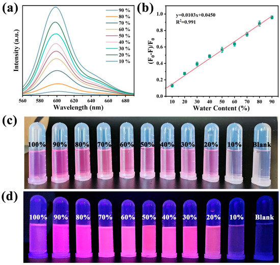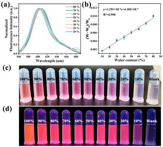 To assess the potential of R-GQDs for detecting water content in organic solvents, their fluorescence spectra have been analyzed in THF, DMF, and ethanol with varying water concentrations. As shown in Figure 4a, the fluorescence emission shift ((W − W0)/W0) in DMF has exhibited a gradual redshift from 602 nm to 608 nm with increasing water content. A strong linear correlation (R2 = 0.990) has been observed between the emission peak position and water content, ranging from 10% to 80% (Figure 4b), with a low detection limit (LOD) of 0.065%. Additionally, the solution’s color under daylight has shifted from orange-yellow to pink and eventually pale purple with increasing water content (Figure 4c). Under 365 nm UV light, the fluorescence has transitioned from orange to magenta, followed by gradual quenching (Figure 4d). This fluorescence color change provides a promising method for visually monitoring the water content in organic solvents, especially R-GQDs are almost applicable in the full concentration range from 0 to 100% (v/v) which highlighting the great potential of R-GQDs in practical applications.
